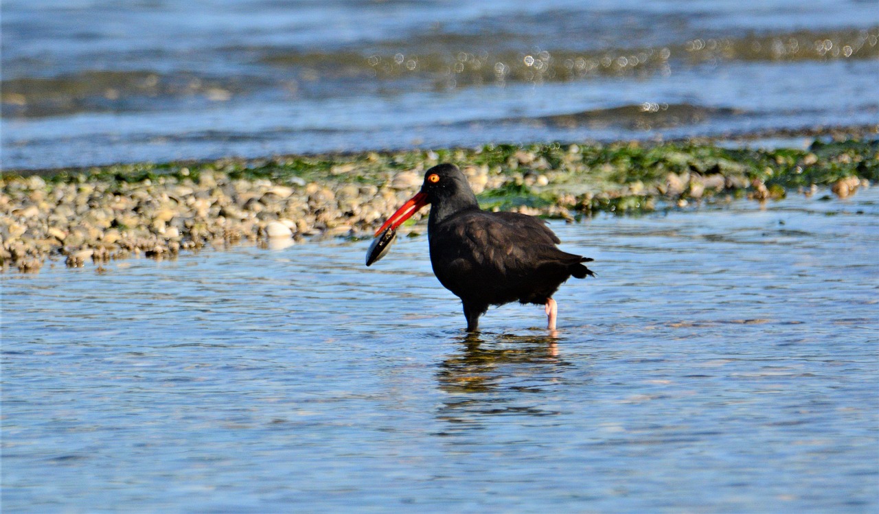 African Oystercatcher – A striking black bird with a bright red beak, seen along the rocky shoreline.